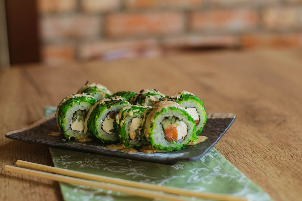 Рис, лосось, нори, сыр творожный, чука, соус ореховый, кунжут
