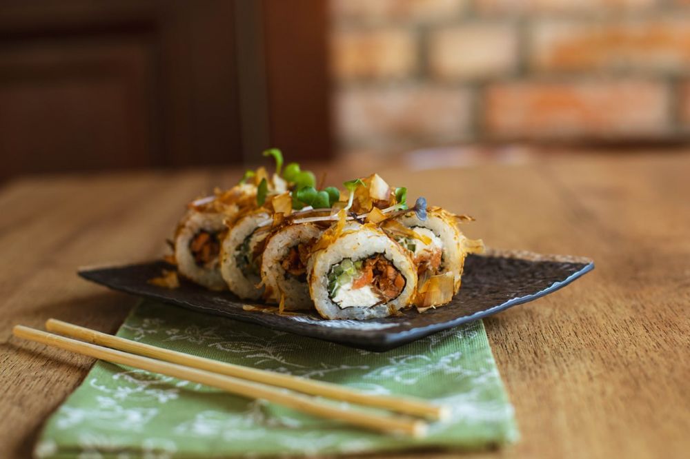 Рис, лосось терияки, нори, сыр творожный, огурец, стружка тунца