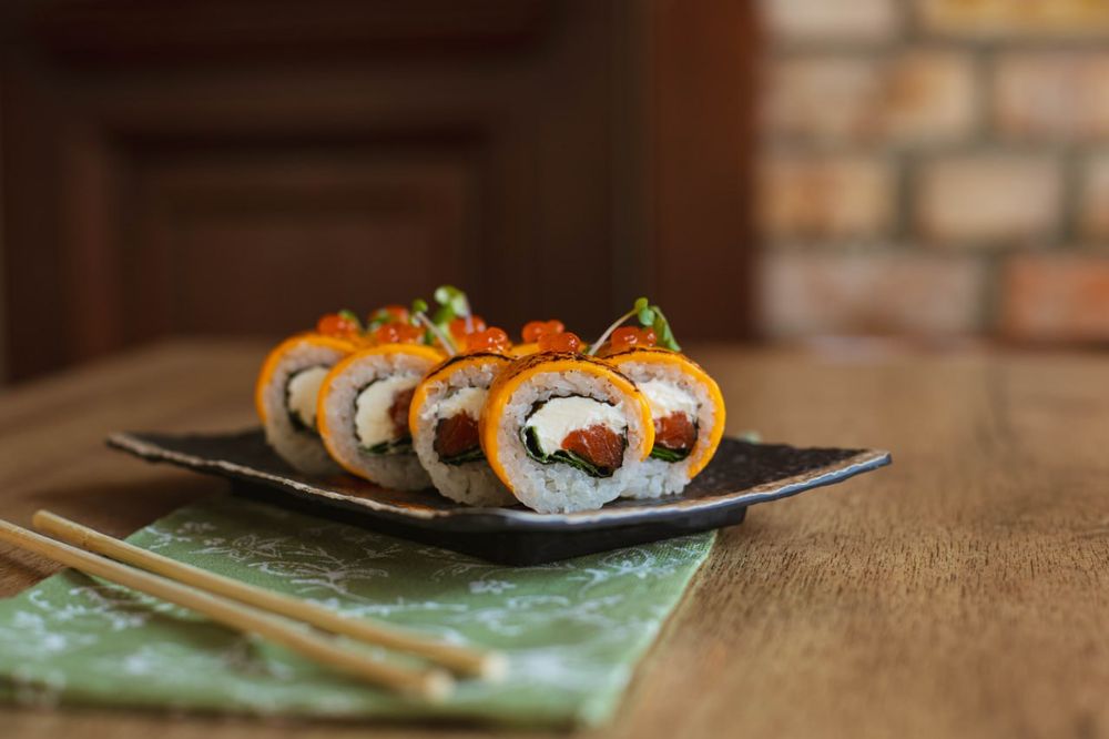 Рис, лосось собственного копчения, нори, сыр творожный, лук зеленый, сыр Чеддер