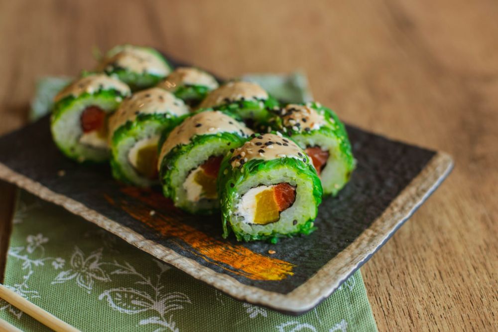 Рис, лосось собственного копчения, нори, сыр творожный, дайкон, чука