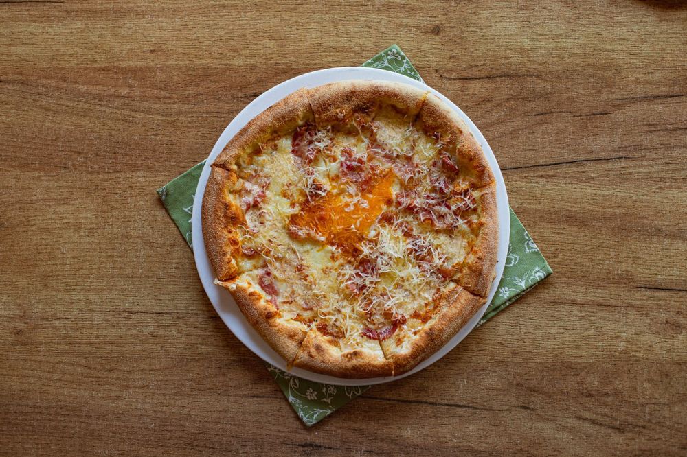 Соус сливочный, сыр Моцарелла, грудинка, сыр Пармезан, желток.